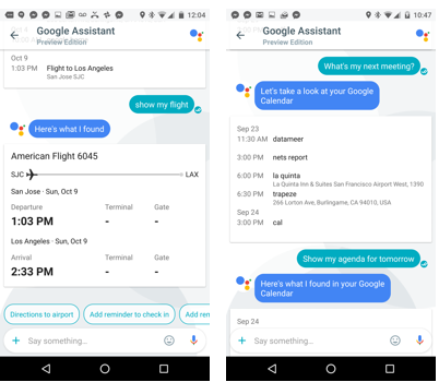 Assistantは利用者のスケジュールを把握しており、秘書のように会議予定などを管理をする。例えば、「Show my flights」と指示すると、予約しているフライト情報を表示する (下の写真左側)。また、「What’s my next meeting」と言えば、今日の予定を表示する (下の写真右側)。Assistantは忙しい生活の中でなくてはならない存在になりつつある。AssistantはGoogle Calendarとリンクしスケジュールを把握している。