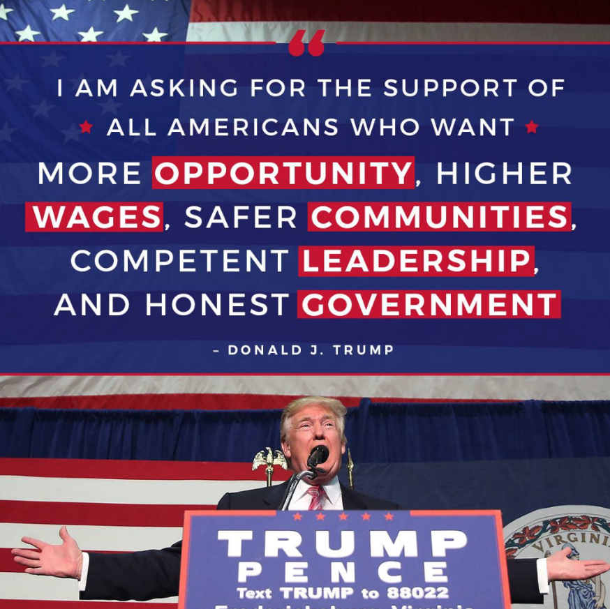 Trump氏の勝利は行き過ぎた格差社会に不満を抱えている労働者層からの支持によるところが大きい。Trump新大統領は格差を是正することを掲げ、米国に雇用を呼び戻し賃金を上げると約束した (下の写真)。選挙結果を受けシリコンバレーではUniversal Basic Income (最低所得保障) の議論がクローズアップされている。低所得者層に現金を支給し、行き過ぎた格差を是正する試みが始まった。