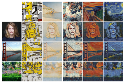 更に、Googleは上述の技法を強化した論文「A Learned Representation for Artistic Style」を発表した。単一ネットワークが32の異なるスタイルのPasticheを生成できる技術を開発した。下の写真がその事例で、写真 (左端) を入力すると、写真は五つの異なるスタイル (最上段) で変換される。前述の技法は一つのスタイルに限定されていたが、この技法では32のスタイルで絵を描くことができる。
