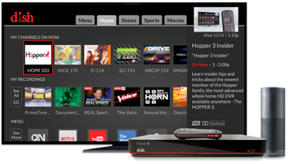 DISHは衛星テレビ会社でテレビ放送やインターネットサービスを提供する。DISHはセットトップボックス「Hopper DVR」をAmazon Echo又はDotとリンクし、テレビを言葉で操作できる機能を提供する (下の写真)。Echoに対し「Alexa, Go to ESPN」と指示すると、テレビはスポーツ番組「ESPN」にチャンネルを変える。番組を検索するときは「Alexa, what channel is the Red Sox game on?」と尋ねる。EchoはRed Soxの試合中継があるチャンネルを回答する。このサービス2017年前半から提供される。これからのテレビはリモコンだけでなく、音声操作が必須のインターフェイスとなる。GoogleはAI会話機能「Assistant」でテレビを音声で操作する機能を提供している。テレビ操作のインターフェイスでもAmazon AlexaとGoogle Assistantが覇権を争うことになる。