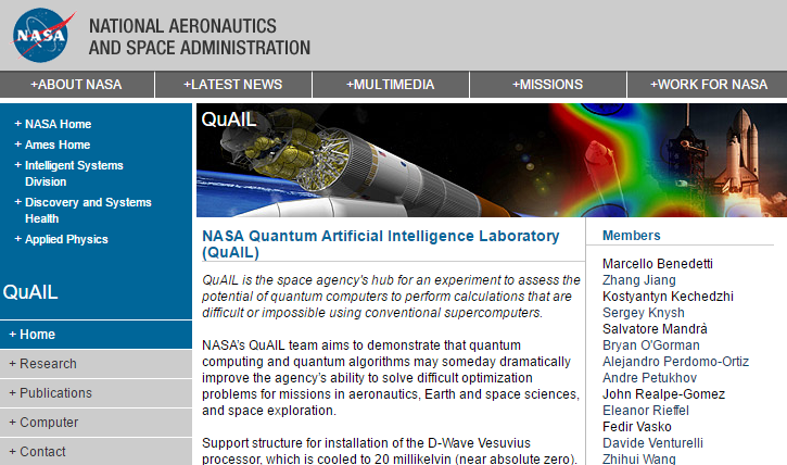 Googleは2009年からカナダのベンチャー企業D-Waveが開発した量子コンピュータを使って研究を進めてきた。2013年、GoogleはNASAと共同で量子コンピュータ研究所「Quantum Artificial Intelligence Lab (QuAIL)」を設立した (下の写真)。量子コンピュータで機械学習や最適化技法を開発することを目的とし、研究所はシリコンバレーのNASA Ames Research Centerに設立された。
