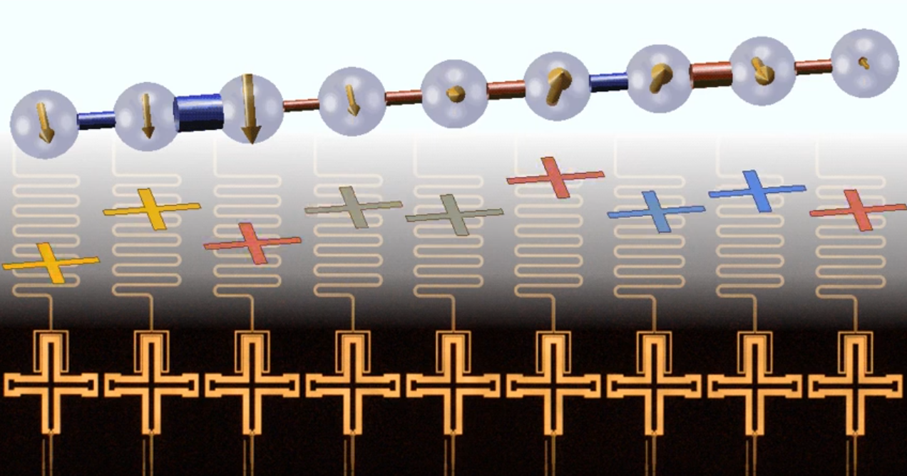 Adiabatic Quantum Computingでタスクを解くためにはQubit間での連結が必要となる。しかし、Googleハードウェア研究部門が開発している量子チップは隣り合うQubitと連携ができるだけ。この制約を補完するためにMartinis教授らはQubitをデジタルに制御してQubit間で連携できる範囲を広げた (下の写真、球体がQubitで矢印はスピンの方向と強さを示す)。個々のQubitを磁場で制御して隣り合ったQubitの方向を合わせ (ferromagnetic link、下の写真の赤色+)、また、方向を反対にする(antiferromagnetic link、下の写真の水色+)操作をする。この方式で物理的にQubitの方向やQubit間の繋がり強度を操作できる。この量子チップをD-Waveのマシンに搭載しアナログ方式の弱点を補完するハイブリッド方式を開発する。