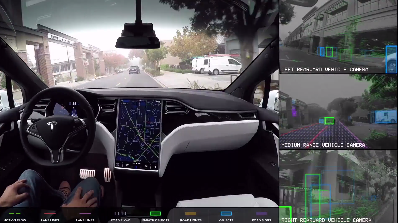 Teslaが提供する完全自動運転機能は「Full Self-Driving Capability」と呼ばれる。最新モデルのModel SやModel 3には必要な機器が搭載されている。センサーとしてはカメラをクルマの周囲に8台搭載している。また、レーダーはフロントに1台、超音波センサーは12台搭載している。このようにTeslaはLidar (レーザーセンサー) は使わないでカメラがクルマの眼となる。センサーのデータは車載スパコン「Nvidia Drive PX2」 で処理される。