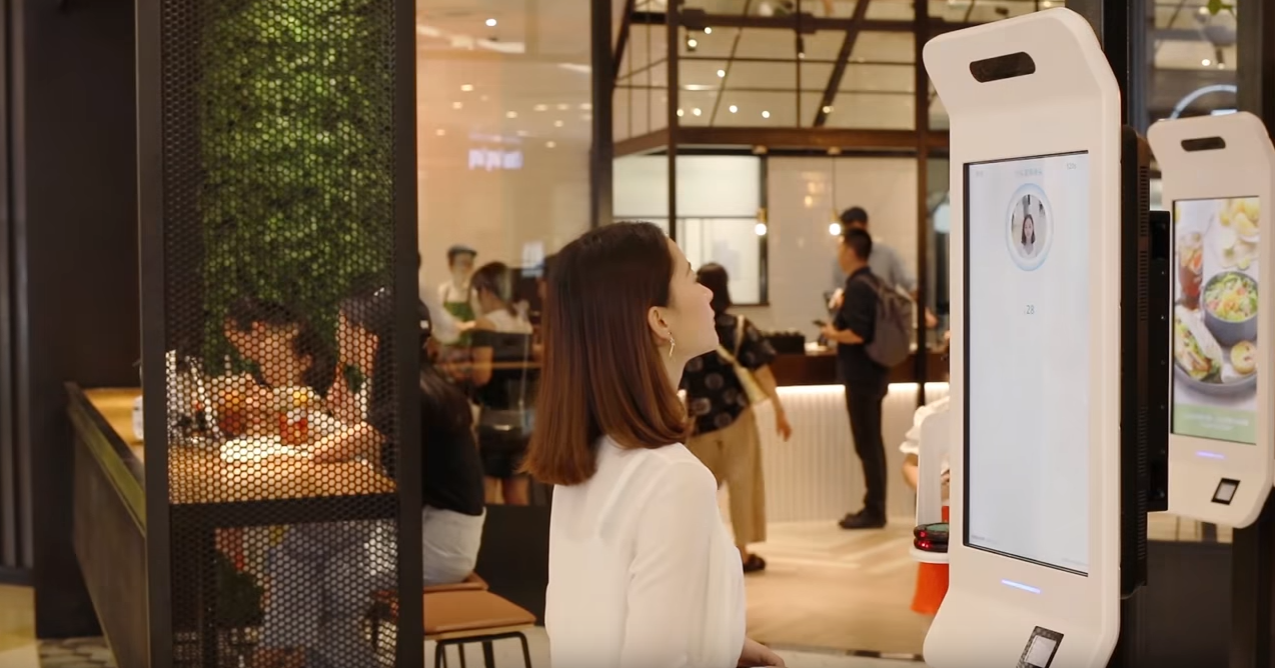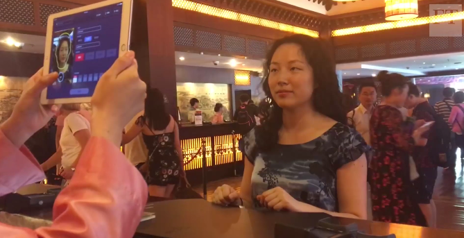 Alibabaは2017年9月、Smile to PayをKFCなどレストランにおける支払いに導入した。消費者は入り口に設置されたキオスクで料理を注文し顔認証で支払いをする (上の写真)。カメラに向かって顔をかざし電話番号を入力すると会計処理が完了する。ステレオカメラが3Dで顔を識別し、アルゴリズムは被写体が写真ではなく人間であることを把握する。将来は電話番号の入力は不要で、顔認証だけで買い物ができるシステムとなる。