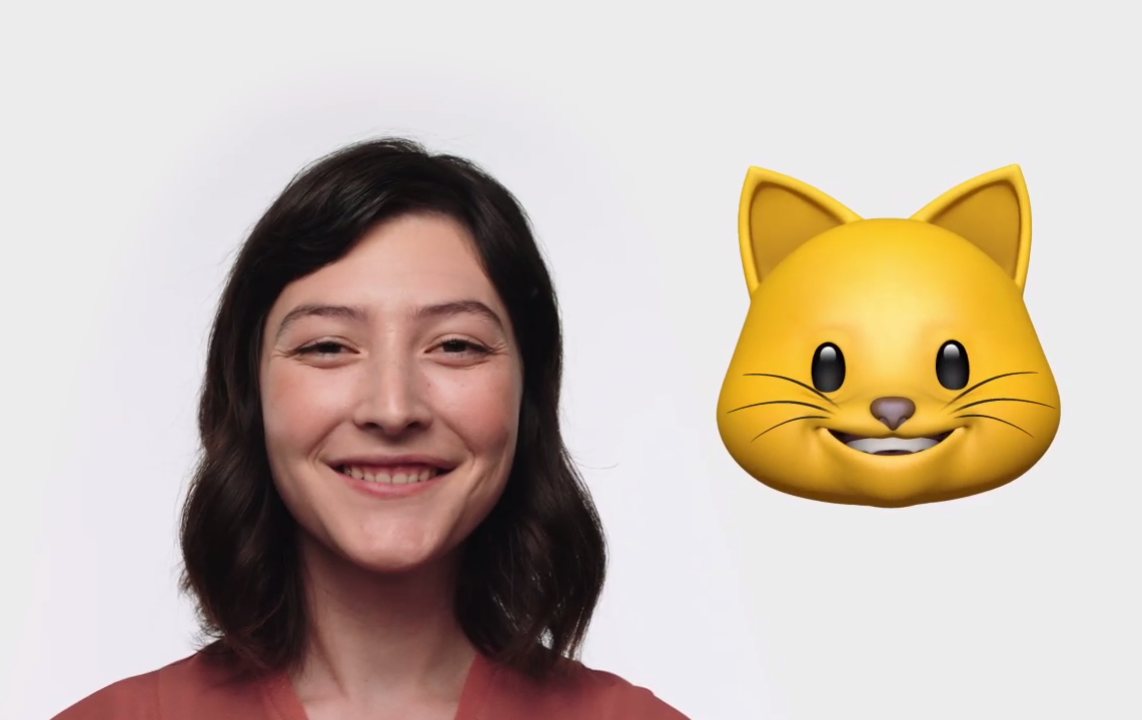 TrueDepth Cameraを使うと絵文字の動画「Animoji」を生成して送信できる。カメラは顔の50のポイントの動きを把握し、これを絵文字キャラクターにマッピングする。笑顔を作るとキャラクターも笑顔になる (下の写真)。ビデオメッセージを作る要領で録画すると、キャラクターがその表情を作り出し音声と共にiMessageで相手に送信される。猫の他にブタやニワトリなど12のキャラクターが揃っている。