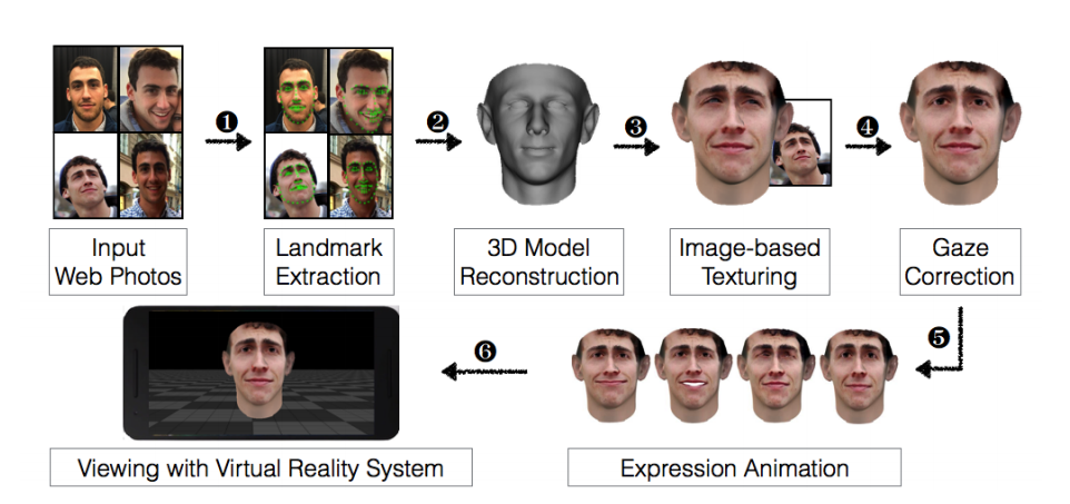 顔認証に関して気になる研究成果が報告されている。昨年、University of North Carolinaの研究者はFacebookやInstagramに掲載されている写真から顔を3Dで構築する手法を公開した (下の写真)。対象者の顔写真を複数枚集め、これらの写真から顔の構造を3Dで再構築する。3D構造に肌の色や質感を加え、更に、様々な表情を追加しVRとしてディスプレイに表示する。