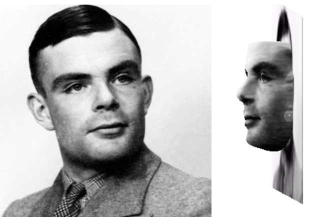 英国の大学University of Nottingham とKingston Universityの研究者は1枚の顔写真からAIを使って顔を3Dで構成する技術を発表した。Computer Visionにとって顔を3Dで把握するのは非常に難しい技術となる。上述の通り、数多くの写真を入力しこれらから3Dイメージを再構築するのが一般的な手法となっている。これに対し、CNN (イメージを判定するネットワーク) を顔写真と本人の3Dイメージで教育することで、アルゴリズムは1枚の顔写真からその3Dイメージを再構築できるようになった。(下の写真、Alan Turingの写真 (左側) を入力するとアルゴリズムは3Dイメージ (右側) を生成する。) 研究成果を使って顔認証システムの試験が実施されたわけではないが、今後はAIを悪用した認証システムへの攻撃が急増することを示している。iPhone Xが発売になるとFace IDのハッキングレースが始まりAppleは様々な挑戦を受けることになる。