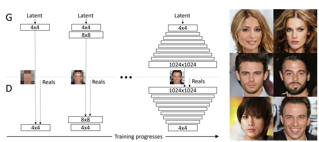 上のダイアグラムでGと記載されている部分 (上段) がGeneratorを示し、Dと記載されている部分(下段)がDiscriminatorを示す。Discriminatorには本物のセレブ写真(Reals) とGeneratorが生成した偽のイメージ (Fake) が入力され、本物か偽物かを判定する。このGANの特徴は教育初期段階では低解像度 (4×4) のネットワーク (左端) を使い、教育が進むにつれて徐々に解像度を上げる。最終的には高解像度 (1024×1024) のネットワーク (右端) を使い鮮明なイメージ (右端の写真) を生成する。NvidiaのGANは出来栄えを検証しながら徐々に解像度を上げる構造となっている。