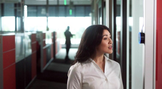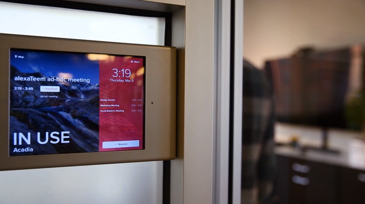 Alexaのビジネスソリューションはパートナー企業により提供される。Teemという新興企業はAlexaと連動し、会議室を管理するスキルを提供する。会議室入り口にディスプレイを設置し、部屋の使用状況を表示する (下の写真)。多くの企業がTeemで会議室を管理しており、Alexaとの統合で、これを言葉で指示できるようになった。