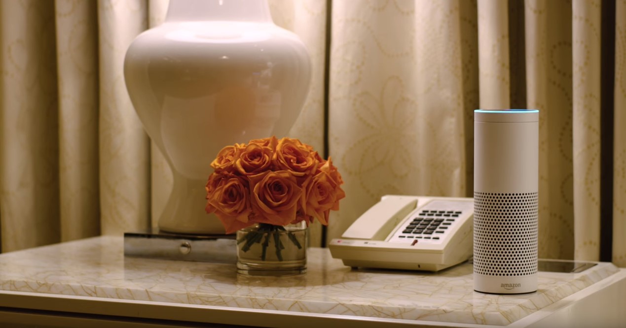 Alexa for Businessに先立ち、Amazon Echoはホテル客室で使われている。Wynn Las Vegasはラスベガスの高級リゾートホテルで、全ての客室にAmazon Echoを導入すると発表。4,748台のAmazon Echoが設置され、宿泊客はホテルや客室情報をEchoに尋ねることができる (下の写真)。
