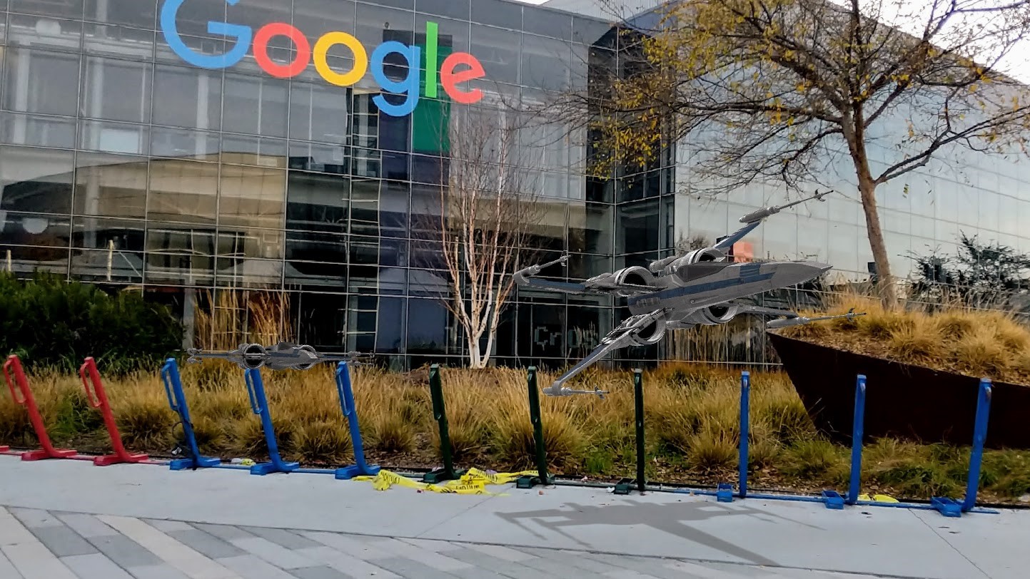 現実社会が理解できると、ARCoreはオブジェクトを生成しその中に置くこととなる。オブジェクトは現実社会に馴染み、自然な形で配置される。ARCoreは周囲の状況を把握しており、利用者はPosesを変えることができる。つまり、カメラを動かしオブジェクトの周囲を周回し、異なる方向から撮影できる。X-wingを周回し背後からも撮影できる (下の写真)。オブジェクトの周りを移動してもX-wingはホバリングを続け、アンカーで固定されているようにその場所に留まる。