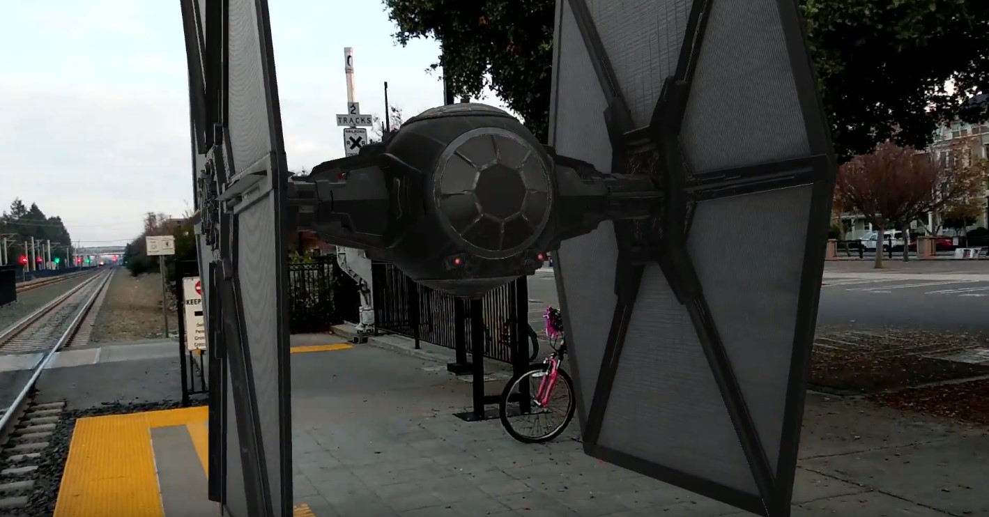 反乱同盟軍の戦闘機「X-wing Fighter」を選ぶと、可変翼をX状に広げ空中をホバリングする。戦闘機は背景の明るさに調和し、地上にはその影を落とす。戦闘機を前から撮影するだけでなく、周囲をぐるっと一周して360度のアングルから撮影できる。戦闘機は背景に溶け込み、仮想イメージであるとは思えない。