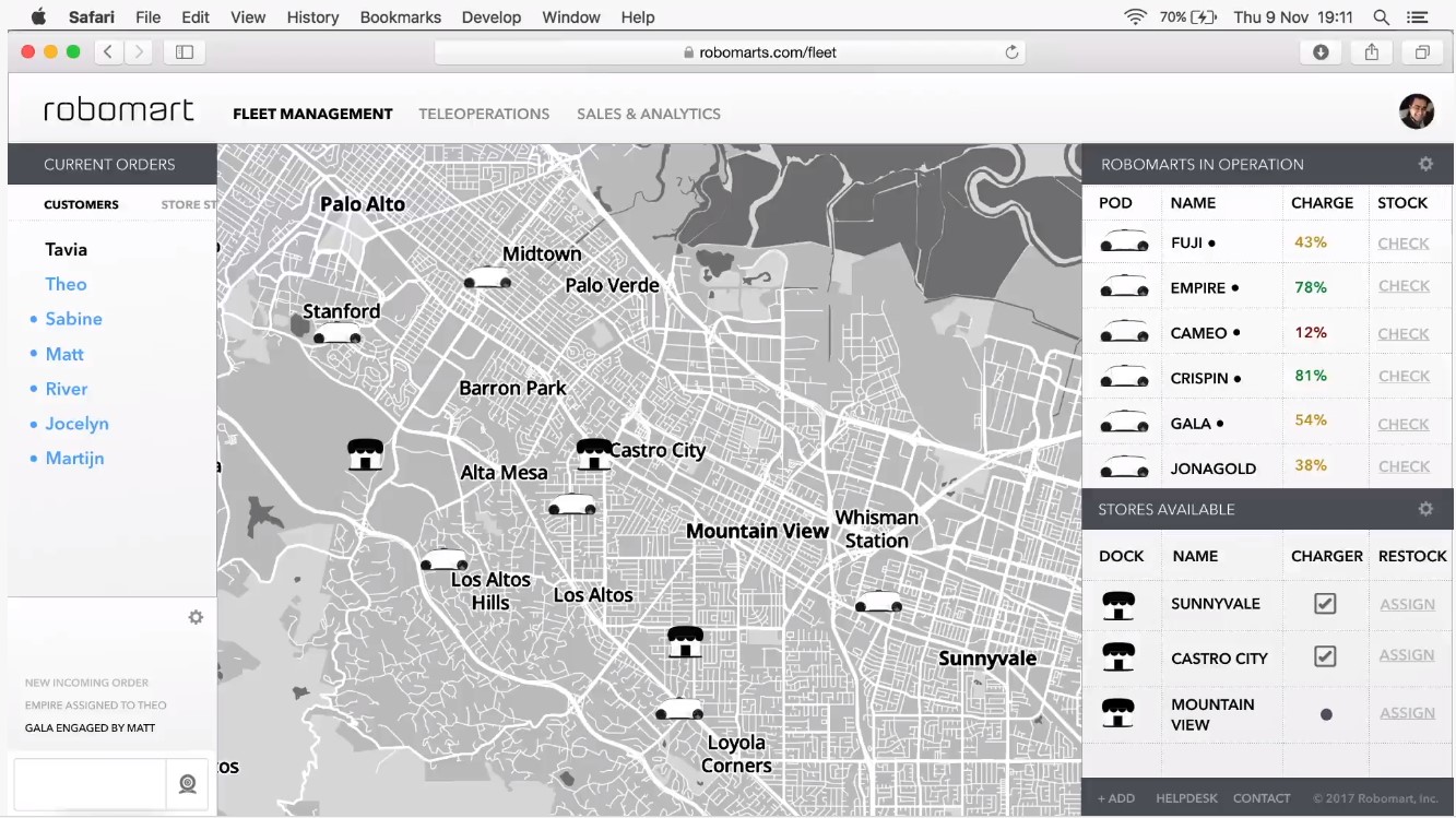 Robomartは自動で走行するが、運行状態については各店舗のオペレーターが遠隔で監視する (下の写真)。オペレーターはRobomartの配車リクエストや走行経路をデスクトップでモニターする。また、品切れの際はRobomartを運用している小売店舗が商品を補充する。更に、遠隔通信機能があり、オペレーターは消費者と直接会話することができる。買い物で支障が出た時はオペレーターがサポートする。経路上で警察官とコミュニケーションが必要な時もこの機能を利用する。