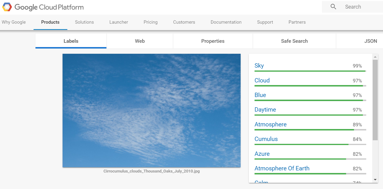 Cloud Vision APIを使うと簡単に写真の分類ができる。イメージを入力するとシステムはその属性を出力する。例えば、空に浮かんだ雲の写真を入力すると、システムは解析結果として「Sky」や「Cloud」と回答する (下の写真)。その他に、写真に写っている顔を把握し、その表情を分類する機能もある。