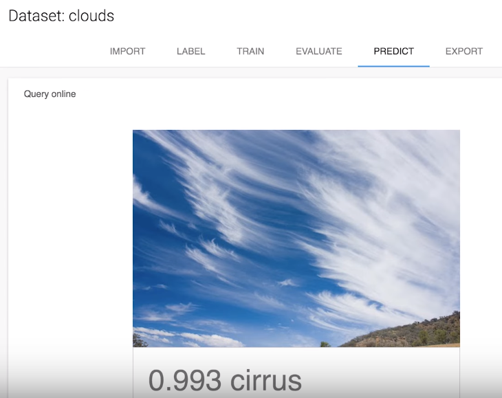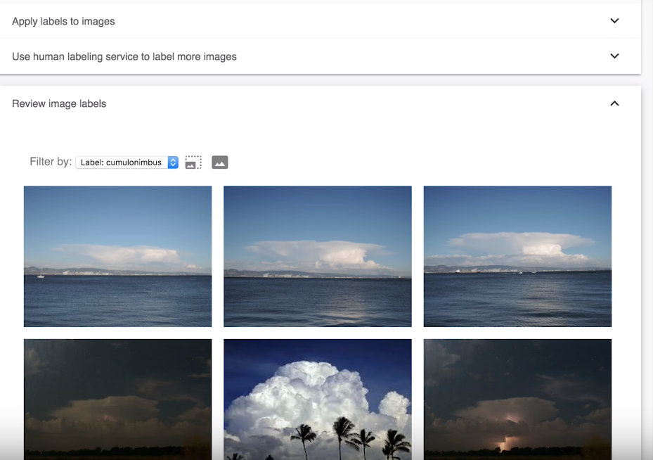 具体的にはCloud AutoMLのインターフェイスに沿ってこれらの操作を実行する。まず、「Label」のページでタグ付きの写真データセットをアップロードする。ここでは種別ごとの雲の写真をアップロードする。(下の写真、「Cumulonimbus (積乱雲)」というタグがついている雲の写真をアップロード)。 AutoMLは自動で機械学習アルゴリズムを生成し、「Train」というページで、アップロードされた写真を使ってアルゴリズムを教育し最適化する。