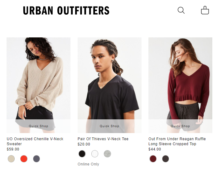 Cloud AutoMLを業務に応用した事例が公開されている。ファッションブランドUrban Outfittersは商品にタグ付けするプロセスをCloud AutoMLで自動化した。Urban Outfitters は、商品に付加されたタグをキーに、消費者に関連商品を推奨する。また、商品検索や商品フィルタリングでもタグが使われる。Cloud AutoMLは商品イメージを解析し商品の特徴量を抽出する。例えば、洋服を分類する際に胸元に着目すると、Cloud AutoMLは商品を「V-Neck」、「Scoop」、「Crew」などと判定する。アルゴリズムはデザインパターンやネックラインなどをキーにタグを生成する。(下の写真、ウェブサイトを「V-Neck」で検索した結果。)