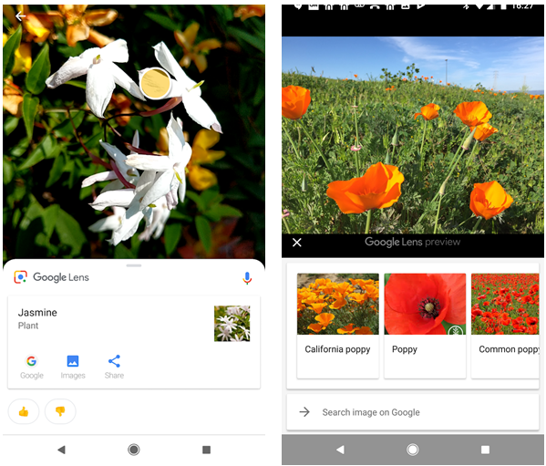 Google Lensを植物に向けるとその名前を教えてくれ、植物図鑑として使うことができる。カメラで白い花を見ると、Google Lensはこれは「Jasmine」(ジャスミン)と教えてくれる (下の写真、左側)。写真撮影した草花の種類をGoogle Lensで調べることができる。よく見かけるオレンジ色の花の写真をGoogle Lensで調べると、これは「California Poppy」(ハナビシソウ)であることが分かった。植物の判定は難しく高度なニューラルネットワークが必要であるが、Google Lensを花に向けると敏感に反応し正解率は悪くない。一方、樹木や木の葉にについてはアルゴリズムの教育ができていないのか、認識力が大きく落ちる。制限事項はあるものの、Google Lensで身の回りの植物の種類を知ることができ、コンピュータビジョンの進化を肌身で感じる。