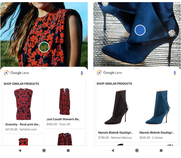 Style Matchはファッションや家具などをアドバイスする機能。Google Lensでお洒落な洋服を見ると、その洋服と同じデザインの別の製品を表示する (下の写真、左側)。気に入ればそのまま購入できる。その他にGoogle Lensでシューズやバッグを見ると、同じ趣向の商品を表示する (下の写真、右側)。家の中では、Google Lensで家具を見ると、類似の商品を示す。Amazonなどショッピングサイトで同様な機能があるが、Google Lensはカメラで捉えたライブイメージが対象で、リアルタイムで画像解析を実行し、デザインが似ている商品を検索するので、高度な技術が必要となる。