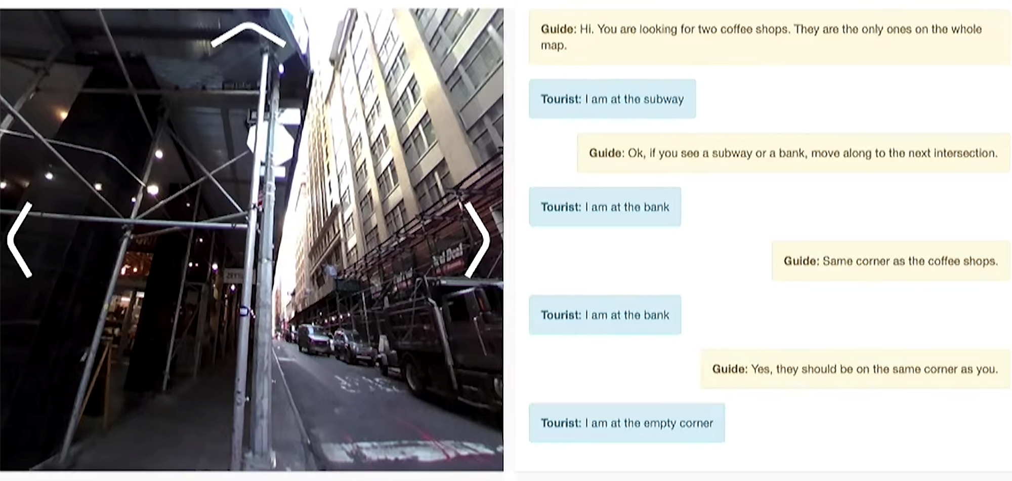 フェイスブックAI研究所は、言葉を環境と結びつける手法でAIを教育する研究を進めている。Talk the Walkが教育モデルとなり、ニューヨーク市街地で、二つのAgent (ガイドと観光客)が会話しながら、目的地を目指すタスクを実行する。ガイドはマップを見て目的地を把握できるが、観光客の場所は分からない (下の写真右側)。一方、観光客はマップを見ることはできないが、周囲360度の風景を見ることができる (下の写真左側)。ガイドは観光客と会話しながら目的地まで誘導する (下の写真中央部の吹き出し)。つまり、道に迷った観光客が案内所に電話して、目的地までの道順を聞いている状態を再現した形となる。