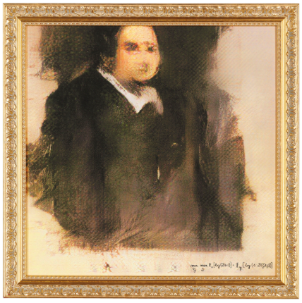 GANが芸術作品を生み出し、それが高値で落札されたことで、一躍その手法に関心が集まった。フランスのAI芸術家集団「Obvious」はGANで絵画を生成する手法で芸術の普及に貢献している。その代表作「Edmond De Belamy」がChristie’sのオークションで$435,000で落札された(下の写真)。AIが生成した絵画に高値が付き市場を驚かせた。作品はある家族(Belamy Family)を描いたもので11点が制作され、その一点がこのEdmond De Belamy である。