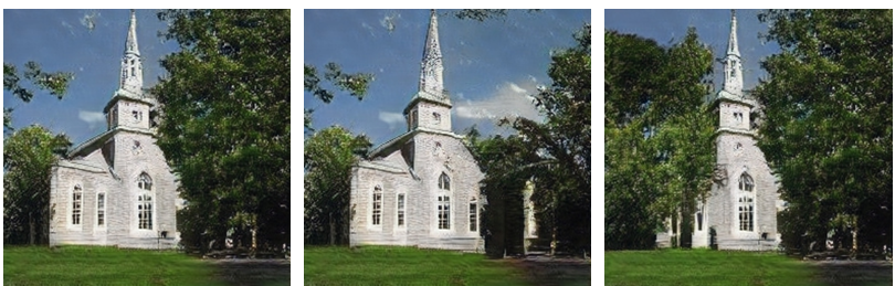 更に、特定したユニットの機能をオン・オフさせ、その効果を検証した。特定のユニットの機能を停止させることで、オブジェクトを取り去ることができることを示した。反対に、そのユニットの機能を強化することで、オブジェクトを追加できることも示した。(下の写真がその事例、左端がオリジナルのイメージで、木に関連するユニットの機能をオフ・オンすることで、木を削除(中央)したり、追加(右端)できる。)