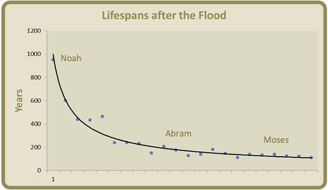 大洪水の前は長生きをしていのに、その後寿命が短くなっていくが、その理由について様々な解釈がある。その一つが、ノアの洪水の時、神は人間の寿命の上限を120歳に定めたという解釈。ノアの洪水からモーゼの出エジプトまでは750年の開きがあるが、この期間に寿命が950歳から120歳まで徐々に短くなった。これは神が介入(Devine Intervention)し遺伝子を操作し、それが年代を経て伝わり、寿命が徐々に短くなったという考え方で、宗教界ではこの解釈が一般的。