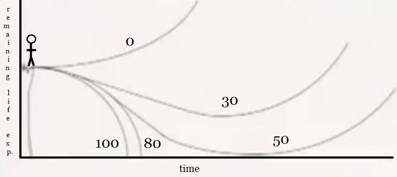 食料が足りている今の時代に、120歳に制限された人間の寿命を延ばす研究が進んでいる。また、人間は何歳まで生きることができるのか議論が続いている。その一つが「Longevity Escape Velocity」という考え方で、長寿を達成するための仮定として議論される。具体的には、Longevity Escape Velocityは1年歳を取る間に、1年以上寿命が延びる状態を意味する。例えば、一つ歳を取る間に、寿命を二年延ばす技術が登場すると、人間は永遠の生命を手にすることになる。(下のグラフ、Longevity Escape Velocityを示したもので、縦軸が平均余命で、いま50歳以下の人は永遠に寿命が延びる。一方、いま80歳以上の人はこの恩恵にあずかれない。)