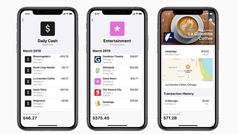 Appleがクレジットカードをデザインすると使いやすくなる。Apple Cardで買い物をすると、購買記録は綺麗に整理されて表示される。買い物の内容を確認する際はアイテムにタッチすると、店舗名やその場所が画面に示される(下の写真、右側)。購買アイテムはカテゴリーごとに整理され (同中央)、週ごとに購買金額とそのカテゴリーがグラフで示される。