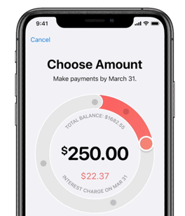 Apple Cardでローンを組むとその返済金額と利子が分かりやすく表示される。例えば、ローン残高が1,682.55ドルのケースでは、250ドル返済するとその時の利子は22.37ドルであることが分かる(下の写真)。支払い金額により利率が変わり、1,180.78ドル返済すると利子がゼロとなる。分かりやすい表示でローン返済を促すデザインとなっている。