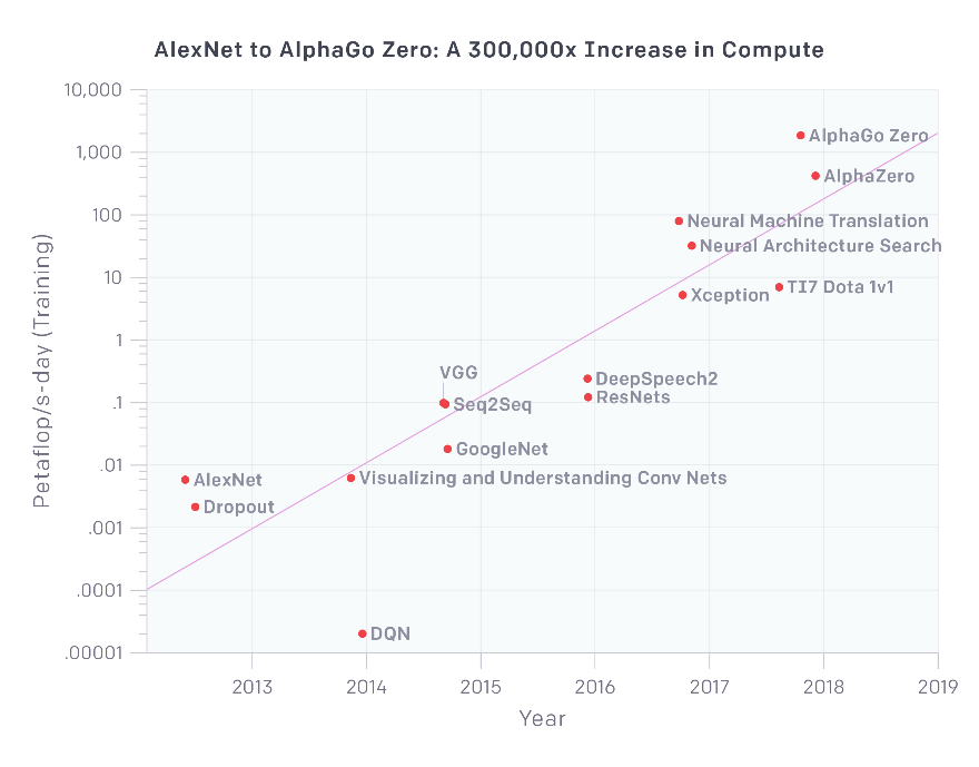 この研究とは別に、OpenAIはニューラルネットワークの規模が急速に巨大化していることを明らかにした。ニューラルネットワークの構造が複雑になり、それを教育するための計算量が幾何級数的に大きくなっていることを定量的に示した(下のグラフ)。ニューラルネットワークを教育するための計算量(PetaFlops-Day、1日に千兆回計算する量を1とする)で比較すると、1年間で10倍になっていることが分かる。最初のニューラルネットワーク「AlexNet」と最新のニューラルネットワーク「AlphaGO Zero」を比較するとその規模は30万倍になっている。