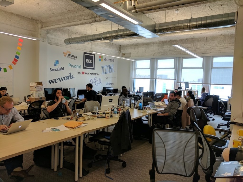 500 Startupsはサンフランシスコに拠点を置くアクセラレータで、起業家にシードファンディングを行ない、技術開発と事業化を支援する。500 Startupsは2010年に創設され、今年で9周年を迎え、ポートフォリオが拡大している。今までに、74か国の2200社に投資し、3000人の起業家が巣立った。Y Combinatorと並びシリコンバレーを代表するアクセラレータで、ここから次のElon Muskの登場が期待されている(下の写真、オフィス内の様子、新興企業は長テーブルで隣り合って技術を開発)。