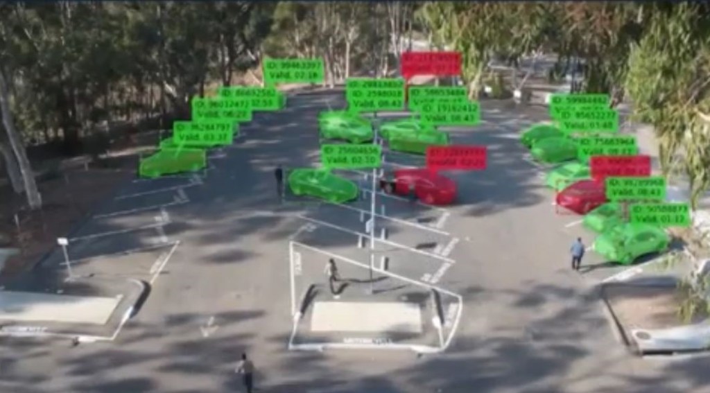 このシステムの背後でコンピュータビジョンが使われている。駐車場に設置されたカメラの映像をニューラルネットワーク(Convolutional Neural Network)で解析し、駐車スポットを把握(parking space classification)する。更に、スポットにクルマが駐車されていることを認識し、そのナンバープレートを読む(license plate recognition)。そして、登録車両データベースでナンバープレートをキーに検索し、駐車許可証の種類を把握する。駐車許可証を有しているクルマは緑色で、許可なく駐車しているクルマは赤色で表示される(下の写真)。