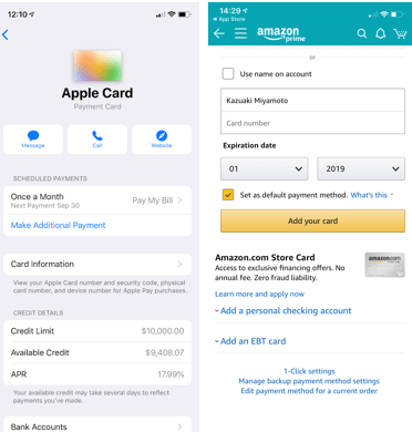 Apple Payを取り扱っていないオンラインショッピングでApple Cardを使うときは手間がかかる。Apple Cardのカード番号を決済サイトに入力する必要があるからだ。カード番号を見るには、Apple Cardを起動して(下の写真左側)、「Card Information」のページを開く。ここに表示されるカード番号、有効期限、PINを参照し、それらをオンラインサイトの決済画面に入力する(下の写真右側)。いつもは、クレジットカードに印字されているこれらの情報を入力するが、Titanium Apple Cardにはカード番号は印字されていないし、セキュリティの観点から、この番号はApple Cardの番号とは異なる構造を取る。Apple Cardの番号は「Card Number」と呼ばれ、オンラインショッピングではこの番号を使う。