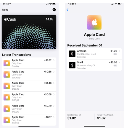 Apple Cardの魅力は買い物をするとキャッシュバックを受け取れること(下の写真左側)。キャッシュバックは月ごとではなく、買い物をした日に受け取れる(下の写真右側)。キャッシュバックは「Apple Cash」に振り込まれ、送金や買い物で使うことができる。Apple製品を買うと購買金額の3%のキャッシュバックを受ける。また、Apple Payで買い物をすると購買金額の2%を、Titanium Apple Cardで買い物をしたら1%のキャッシュバックを受ける。
