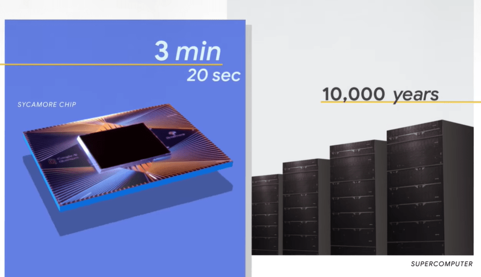 Googleは2019年10月23日、量子コンピュータの性能がスパコンの性能を超えたと発表した。Googleは世界で初めて「Quantum Supremacy(スパコン越え)」に到達したとアピールした。このベンチマークでは量子プロセッサ「Sycamore」が使われ、単純なゲート操作を実行した。徐々にQubitの数と実行回数を増やして実行され、スパコンでは計算できない規模に到達した。この規模の演算はGoogleの量子コンピュータを使うと200秒(3分20秒)でできるが(下の写真左側)、最速スパコン「Summit」を使っても1万年かかると推定した(下の写真右側)。一方、IBMは同じタイミングで論文を発表し、これをスパコンで実行すると2.5日で解けるとし、GoogleはQuantum Supremacyに到達していないと反論した。両社の意見が真っ向から対立し、市場はこの発表をどう受け止めるべきか困惑が広がっている。