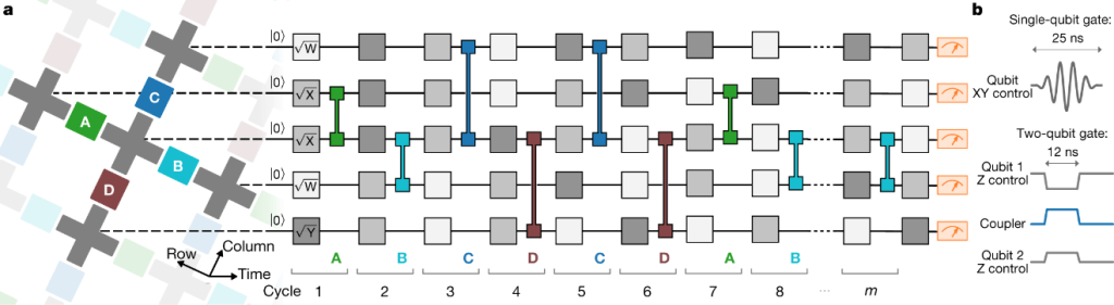 量子ゲートは基本演算の論理ゲートとなり、これらを組み合わせて単純な処理を実行し、その結果が計測された。(下のグラフィックス:量子ゲートの事例。左端がSycamoreでXの部分がQubitを示す。Qubitは接続装置(Coupler、A・B・C・Dで示される部分)を経由して隣の4つのQubitに接続される。Qubitは単独で、また、二つのQubitを連結して実行された(中央部分)。処理は左から右に進みその実行結果が計測された(右端)。)