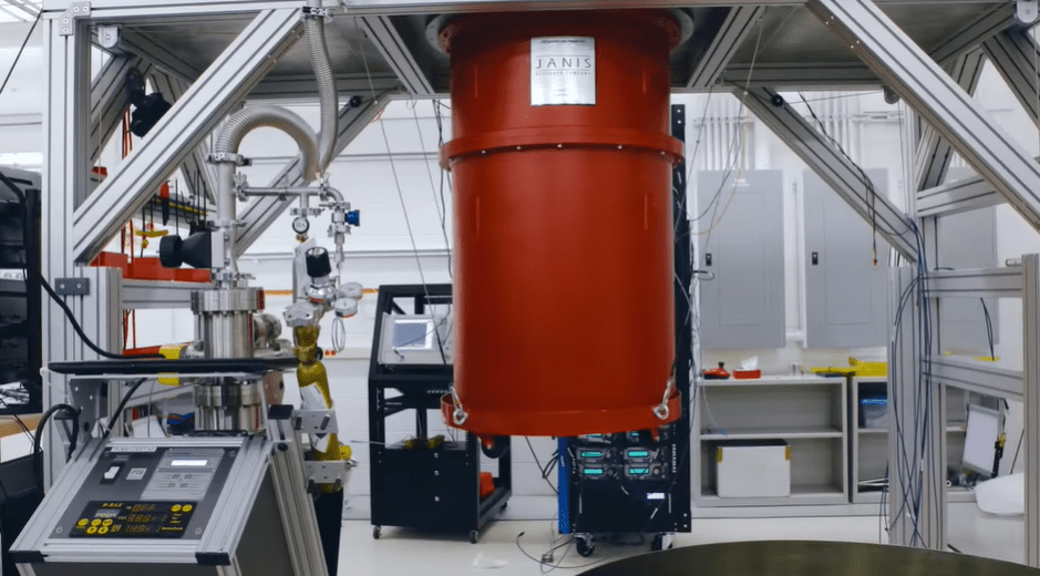Sycamoreは54Qubit構成のプロセッサで、Qubitは平面に配置され、隣の4つのQubitと接続する。Qubitはこの結合を通してすべてのQubitと結び付くことができる。SycamoreでQuantum Supremacyに到達できた理由はQubitの信頼性が向上しエラー率の低いゲートを構成できたことにある。Sycamoreプロセッサは超電導回路で構成され、システム全体は円筒状の冷蔵装置(Cryostat)に格納され、絶対零度近辺まで冷却して運用される(下の写真)。