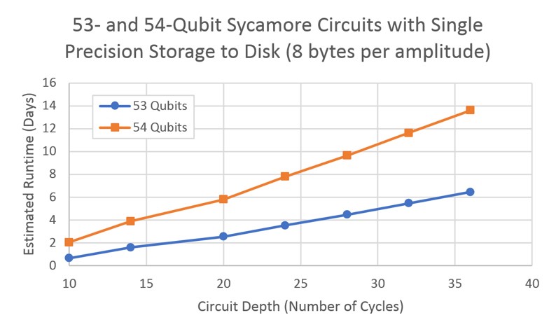 IBMはGoogleが論文を公表した二日前に、それに反論する論文を掲載した。これは「Leveraging Secondary Storage to Simulate Deep 54-qubit Sycamore Circuits」という表題で、Googleが達成したというQuantum Supremacyに異議を差し挟んでいる。Quantum Supremacyの定義の一つは「スパコン越え」であるとし、世界最速のスパコン「Summit」を使うと、この処理を2.5時間で実行できるというもの。Googleは計測したQubitの状態をRAM(主記憶)に格納して処理することを前提に、処理時間を1万時間と算定した。しかし、IBMはRAMだけでなくディスクも使い、最適化手法を導入することで2.5時間で処理できると算定した。(下のグラフ:GoogleがSycamoreで実行したタスクをSummitで実行したときの処理時間予測。縦軸が実行時間(日)で横軸がCircuit Depth(処理の繰り返し回数)。53Qubit構成(青色のグラフ)で繰り返し回数が20のポイントをみると2.5日となる。仮にフル構成のSycamore(54Qubit)でも、Summitで実行すると6日で計算できる。)ちなみにSummitはIBMが開発したスパコンでIBMはSummitでのタスク最適化技術を誰より熟知している。