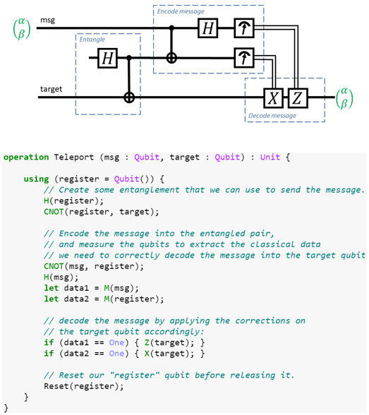 GitHubにサンプルコードとして「量子テレポーテーション(Quantum Teleportation)」が掲載されている。量子テレポーテーションとは、ある場所から別の場所に情報(Qubitの状態)を送信する技術であるが、物質(電子や光子など)を送ることなく、情報を伝える技術である。SF映画に登場するテレポーテーションのように、情報を遠く離れた場所に移動させる技術である。電気シグナルで情報を伝達しないので経路上で盗聴されることはない。極めて奇妙な物理現象であるが、Quantum Teleportationを量子ゲートで示すと下の写真上段の通りとなる。左上のQubitの情報を右下のQubitに送るのであるが、簡単なゲート操作を経て、右下のQubitの状態を読み出すだけで情報が伝わる。この量子ゲートをQ#でコーディングすると下の写真下段のようになる。