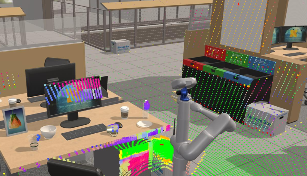 これに対して、Everyday Robotsは人間に交じり、想定外の事象が起きる環境で、日々のタスクを安全に実行する(上のグラフ、Everyday Robots)。自動運転車より難易度が高いというポジショニングとなる。また、Everyday Robotsは人間のしぐさを見てタスクの実行方法を学び、また、他のロボットから学習する機能もある。そして、ロボットはクラウドのシミュレーション環境の中でタスクを学んでいく(下の写真、Lidarで周囲のオブジェクトを把握している様子)。