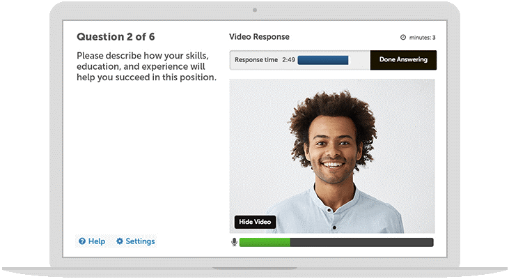 HireVueはSouth Jordan(ユタ州)に拠点を置くベンチャー企業で”ロボット面接官”を開発している。応募者は自身のパソコンから専用サイトにアクセスしAIの面接を受ける。これは「Video Interviewing」(下の写真)というシステムでAIと対話しながら面接が進む。高度なAIが応募者を包括的に評価するが、アルゴリズムの判定基準が不透明で、市場ではロボット面接官への不信感が募っている。