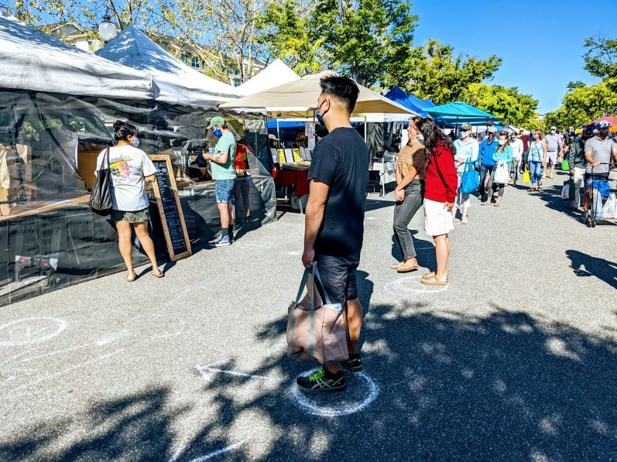 今は、住民の何人がウイルスに感染しているのかなどの基礎データが揃っていない。また、無症状の感染者の実態が分からないため、誰がスプレッダーであるのかを特定できない。更に、抗体が社会復帰のためのパスポートになるのかも定かでない。これらの基礎データをそろえない限り、都市再開を安全に進めることはできない。(上の写真:Farmers’ Marketでソーシャルディスタンシングを保ちながらの買い物)
