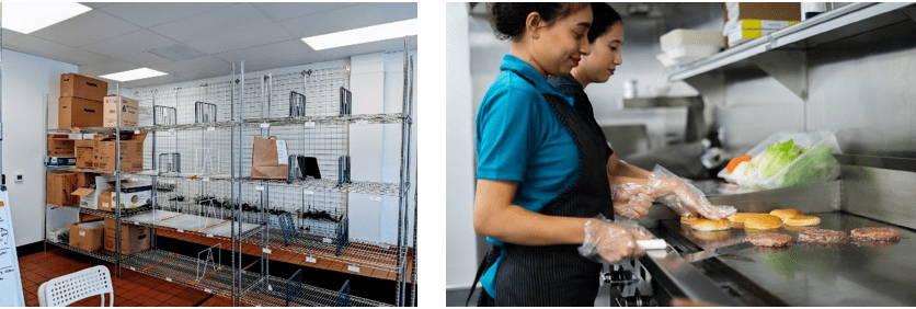 更に、少量の物質(例えば水の分子2000個)を使ってニューラルネットワークを構成すると、ネットワークは大量の物質(水の分子85,000個)の動きを予測する。このため、少量の水で流れ方を教えると(下の写真、右上の箱)、ニューラルネットワークは大量の水の流れ方を学習する(下の写真、全体部分)。