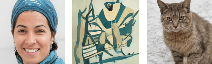 アルゴリズムを再教育し実行するにはそれなりの技量がいるが、StyleGAN2のクラウドを使うと簡単にフェイクイメージを入手できる。その代表が「thispersondoesnotexist」で、StyleGAN2クラウドとしてAIが顔イメージを生成する(下の写真左端)。また、「thisartworkdoesnotexist」は抽象画を生成(下の写真中央)し、「thiscatdoesnotexist」は猫のイメージを生成する(下の写真右側)。これらはどこにも存在しない架空の人物や芸術や猫で、オンリーワンのオブジェクトとして希少価値がある。しかし、これらが悪用されると、真偽の区別がつかず、社会が混乱することになる。