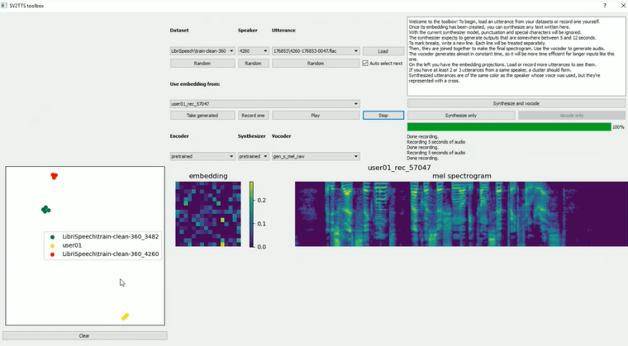 この他に、「SV2TTS」という技法を使うと、フェイクボイスを生成できる。SV2TTSとは、テキストを音声に変換する技術(text-to-speech)であるが、AIが特定人物の声を学習する(下の写真)。例えば、SV2TTSに文章を入力すると、トム・ハンクスがそれを読み上げているフェイクボイスを生成できる。この技術はGoogleのYe Jiaなどによって開発され、GitHubにソースコードが公開されている。