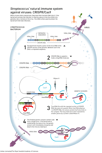 バクテリアは体内に侵入するウイルスをCRISPR-Cas9で防御する。CRISPR-Cas9はバクテリアが持つウイルスに対する免疫機構となる(下のグラフィックス)。