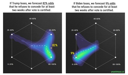Unanimous AIは選挙結果が出た後の両者の行動を予測している。トランプ大統領が負けた場合、94%の確率で、「この選挙は公正でない」と主張すると予測し、実際にこの事態が発生している。また、82%の確率で「勝敗が確定した後も最低二週間は負けを認めない」と予測している(下のグラフ、左側)。つまり、少なくても11月21日まではトランプ大統領は勝ちを主張することになる。