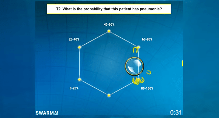 Unanimous AIはこの技法をマーケティング調査や専門家の意見集約などに応用している。実際に、スタンフォード大学医学部は肺のレントゲン写真から結核を判定するプロセスにSwarm Intelligenceを導入した(下の写真)。複数の放射線医師がレントゲン写真から結核の判定をするが、そのプロセスをSwarm Intelligenceで解析すると判定精度が22%向上した。この病院ではAIが自動で結核を判定するシステム「CheXNet」を使っているが、Swarm Intelligenceの判定精度がこれを上回った。人間の知恵を集約することでAIより高度な判定ができることを示している。