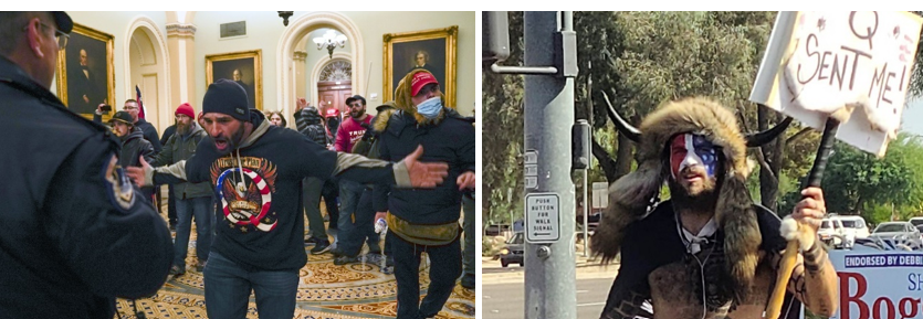 極右団体の代表が「Proud Boys」で、白人至上主義で反イスラム教を掲げ、武器を携行して活動する。「III%er」はThree Percenters(上位3%の愛国者)と呼ばれ、アメリカを独裁政治から守ることを使命とする(下の写真左側、シンボルは星条旗にIIIを入れたデザイン)。名前の由来はアメリカ独立戦争で、国民の3%の愛国者がイギリスと戦い勝利したことによる。(これは歴史誤認でこのような事実はない。)「Oath Keeper」も私兵組織で、武器を携帯して反政府活動を展開する(下の写真右側、帽子にロゴが縫い付けられている)。この組織の特徴は現役兵士や引退した兵士をメンバーに雇い入れ、本格的な軍事活動を展開していること。これら組織のメンバーは”愛国者”を自認し、国民を”守る”ことをミッションとする。