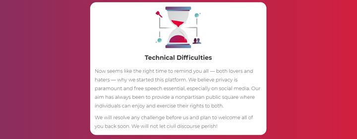 このため、極右団体はFacebookから新興ソーシャルネットワーク「Parler」に大移動を始めた。Parlerは2018年に創設されたソーシャルネットワークで、保守層を中心に利用されてきた。コンテンツの規制が緩やかなことから利用者数を伸ばしてきたが、あくまで一般ユーザを対象にサービスを運用してききた。ここに極右団体が大量に流れ込み、暴力行為やヘイトスピーチを助長する掲載が急増した。このため、ParlerをホスティングするAmazonはこのサービスを中止し、また、AppleやGoogleはParlerアプリをストアーから排除した。(下の写真、閉鎖中のParlerホームページ。CEOのJohn Matezは言論の自由を求めて戦うとの声明をここに掲載。)